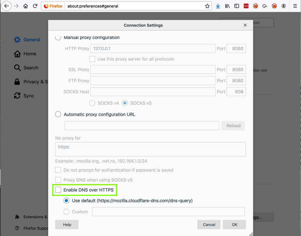 In Firefox setings, check the "Enable DNS over HTTPS" box, as shown below.