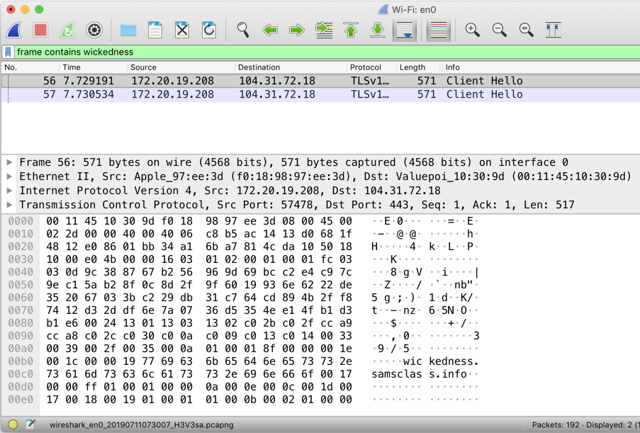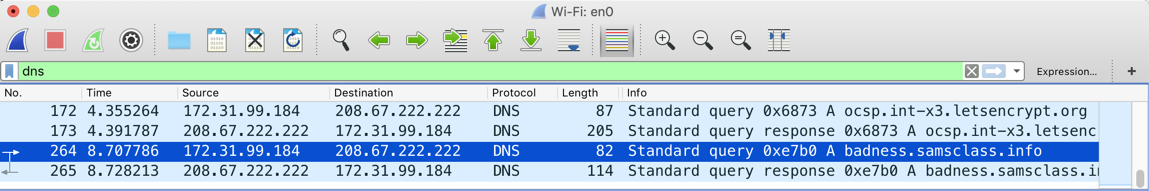 The DNS requests for the "BADNESS" page are visible, exposing the URL to anyone who can sniff your traffic, as shown below.