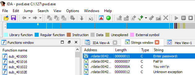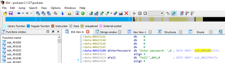The .rdata section appears, showing stored strings. On the line containing "Enter password", find "DATA XREF". Point to the address after the "DATA XREF" marker, as highlighted in yellow in the image below, and double-click it.