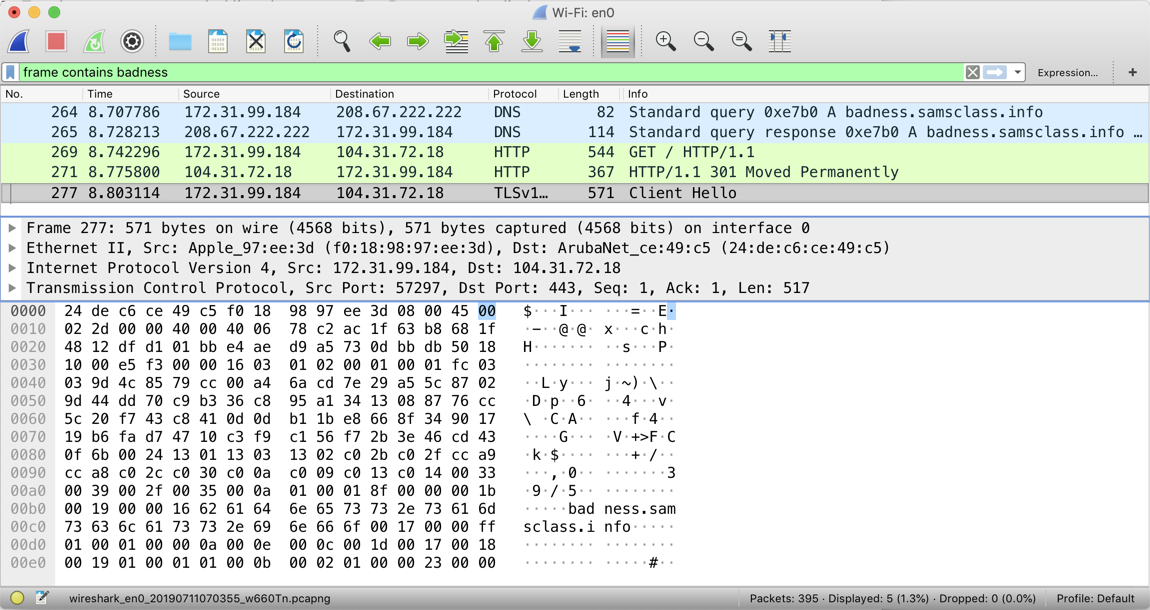 The DNS requests for the "BADNESS" page are visible, exposing the URL to anyone who can sniff your traffic, as shown below.