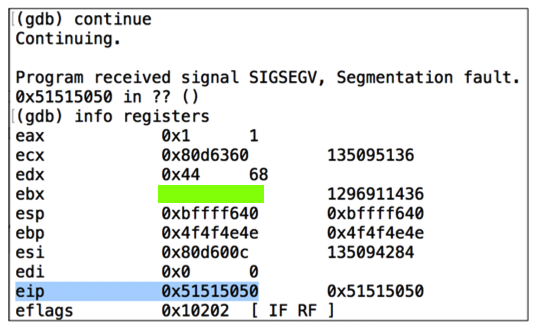 As shown below, the $eip now contains 0x51515050 .如下图所示,$ eip现在包含0x51515050 。 The 4 characters "PPQQ" end up in $eip. 4个字符“PPQQ”以$ eip结尾。info registers