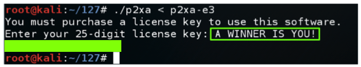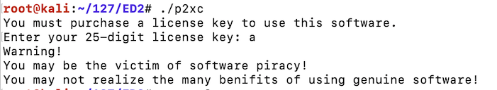 Enter a as the product key.输入a作为产品密钥。 The key is rejected, as shown below.密钥被拒绝,如下所示。curl https://samsclass.info/127/proj/p2xc.c > p2xc.c curl https://samsclass.info/127/proj/p2xc > p2xc chmod a+x p2xc ./p2xc