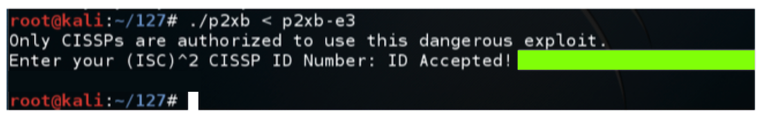 Enter AA as a CISSP ID.输入AA作为CISSP ID。 The ID is rejected.该ID被拒绝。curl https://samsclass.info/127/proj/p2xb > p2xb chmod a+x p2xb ./p2xb