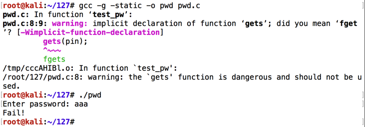 You should see compiler warnings, but no errors.您应该看到编译器警告,但没有错误。gcc -g -static --no-pie -o pwd pwd.c ./pwd