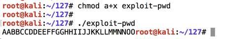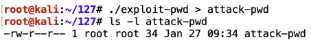 This creates a file named "attack-pwd" containing 34 characters, as shown below.这将创建一个名为“attack-pwd”的文件,其中包含34个字符,如下所示。./exploit-pwd > attack-pwd ls -l attack-pwd