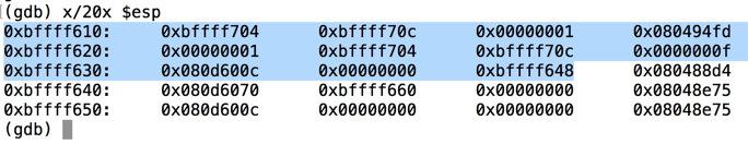 This command is short for "eXamine 20 heXadecimal 32-bit words, starting at $esp".此命令是“eXamine 20 heXadecimal 32位字,从$ esp开始”的缩写。 It shows the stack frame, as shown below.它显示了堆栈帧,如下所示。x/20x $esp