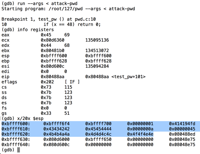 As you can see below, the RET value (just after the highlighted section) is now 0x080488ed -- the value we chose earlier.正如您在下面看到的,RET值(紧接在突出显示的部分之后)现在是0x080488ed - 我们之前选择的值。run --args < attack-pwd info registers x/20x $esp
