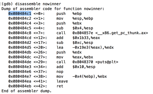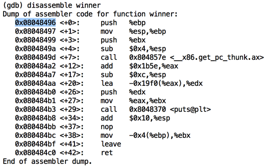 As shown below, this function starts at the address stored on the heap: 0x080484c1 on my system.如下所示,此函数从存储在堆上的地址开始:0x080484c1在我的系统上。disassemble nowinner