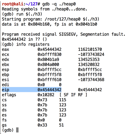 As shown below, the program crashes with $eip = 0x45444342, or the ASCII text 'BCDE'.如下所示,程序崩溃为$ eip = 0x45444342,或ASCII文本'BCDE'。gdb -q ./heap0 run $(./h3) info registers
