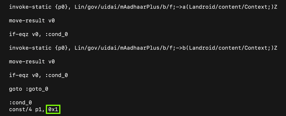If the app is modified, the code sets the parameter "p1" to zero, as highlighted in light gray in the image below.如果应用程序被修改,代码将参数“p1”设置为零,如下图中浅灰色突出显示。