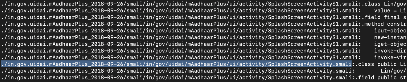 The main smali file path appears, highlighted in the image below.出现主要的smali文件路径,在下图中突出显示。grep SplashScreenActivity -r . grep SplashScreenActivity -r。 | | less -S少-S